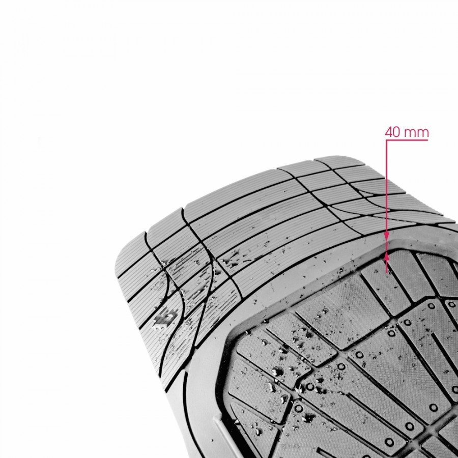 Резиновые шипы на тыльной стороне коврика крепко фиксируют его на полу, не позволяя сдвигаться под педали. Рельефный протектор коврика не дает обуви скользить и обеспечивает надёжный упор ногам водителя.