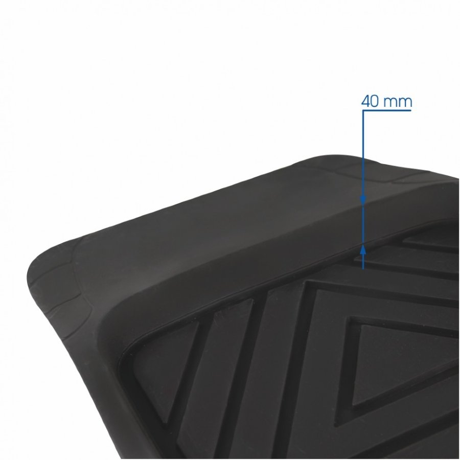 Резиновые шипы на тыльной стороне коврика крепко фиксируют его на полу, не позволяя сдвигаться под педали. Рельефный протектор коврика не дает обуви скользить и обеспечивает надёжный упор ногам водителя.